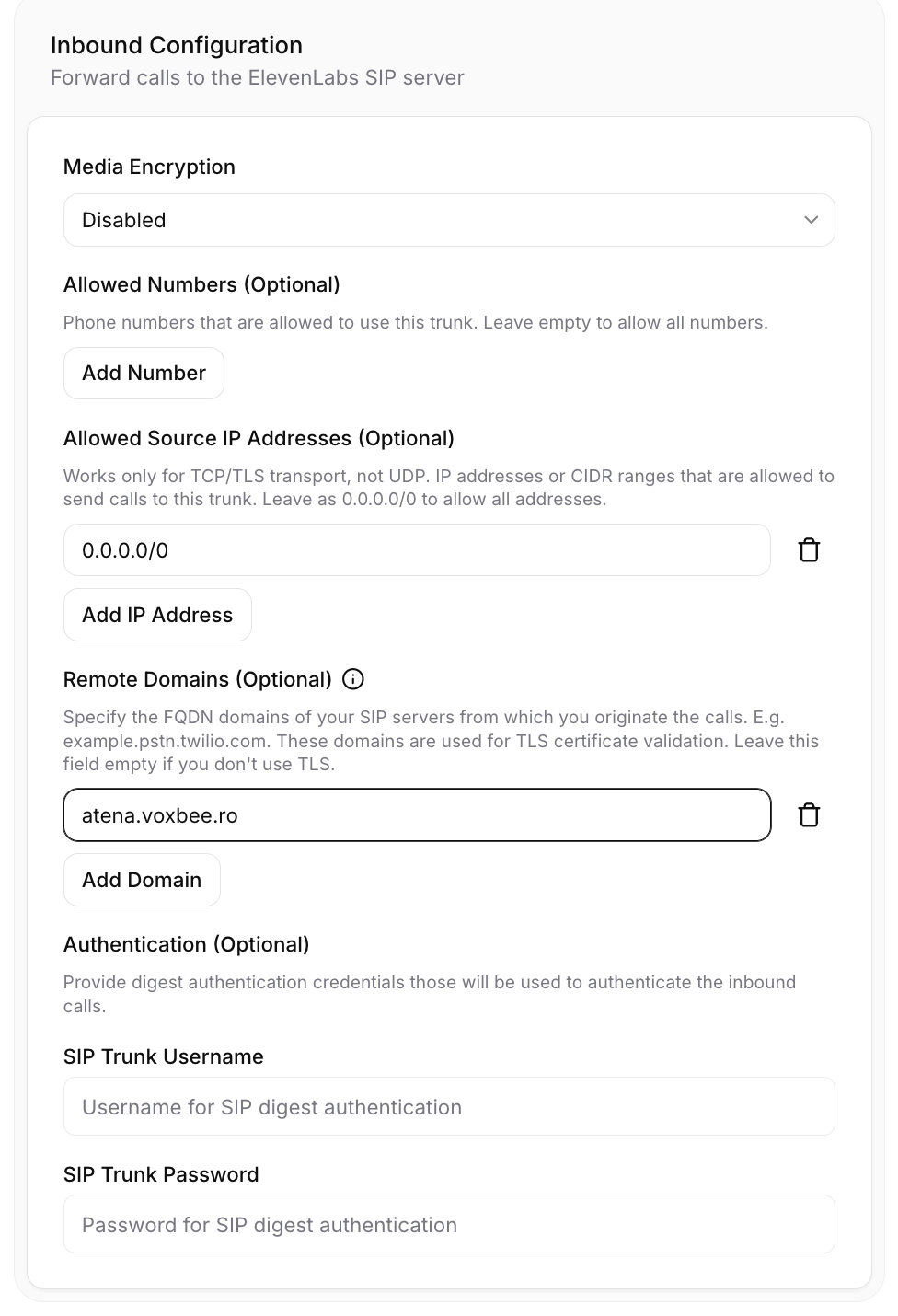 atena.voxbee.ro— fărăhttp://, fărăsip:, fără slash. Câmpurile de autentificare din secțiunea Inbound rămân goale.