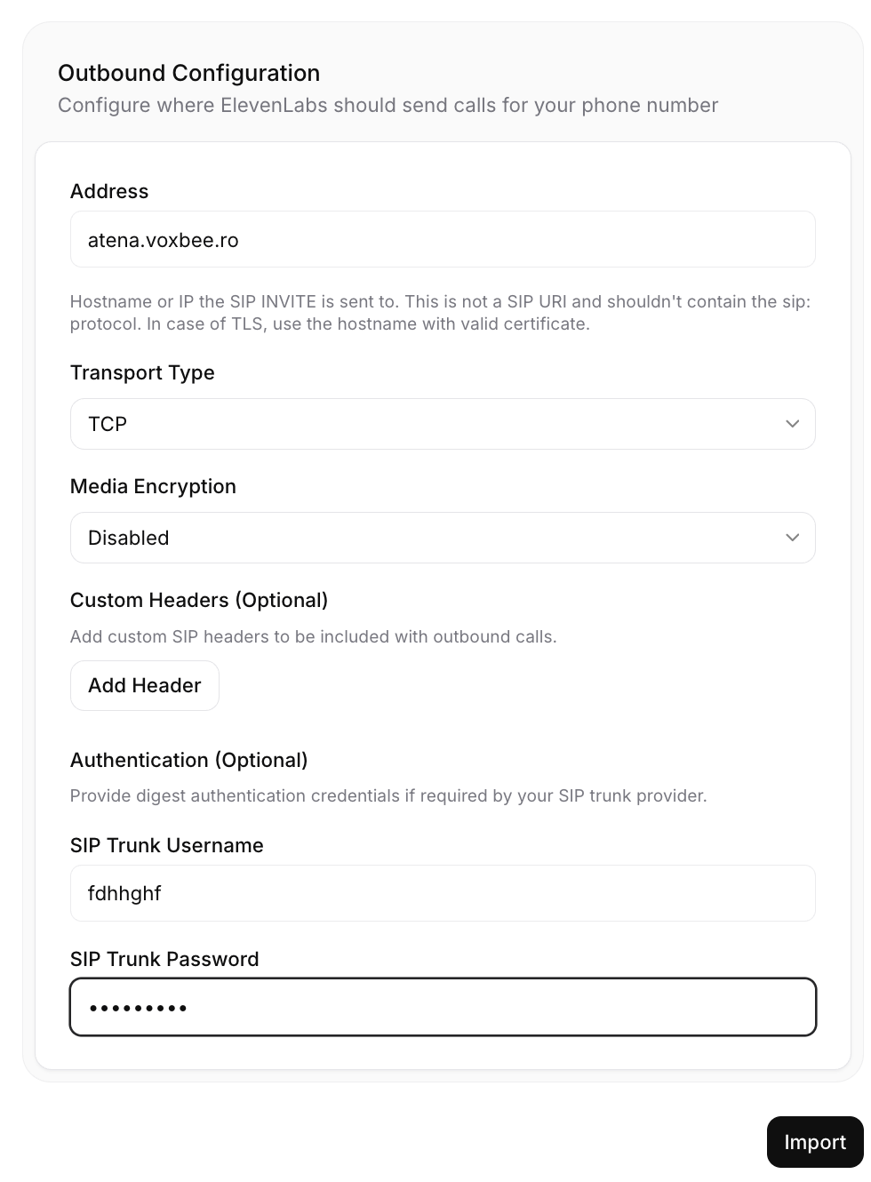 Completează această secțiune doar dacă vrei ca agentul să efectueze și apeluri de ieșire. Vei folosi datele primite prin email la activarea SIP trunk-ului Voxbee, ca în imaginea de mai jos:
